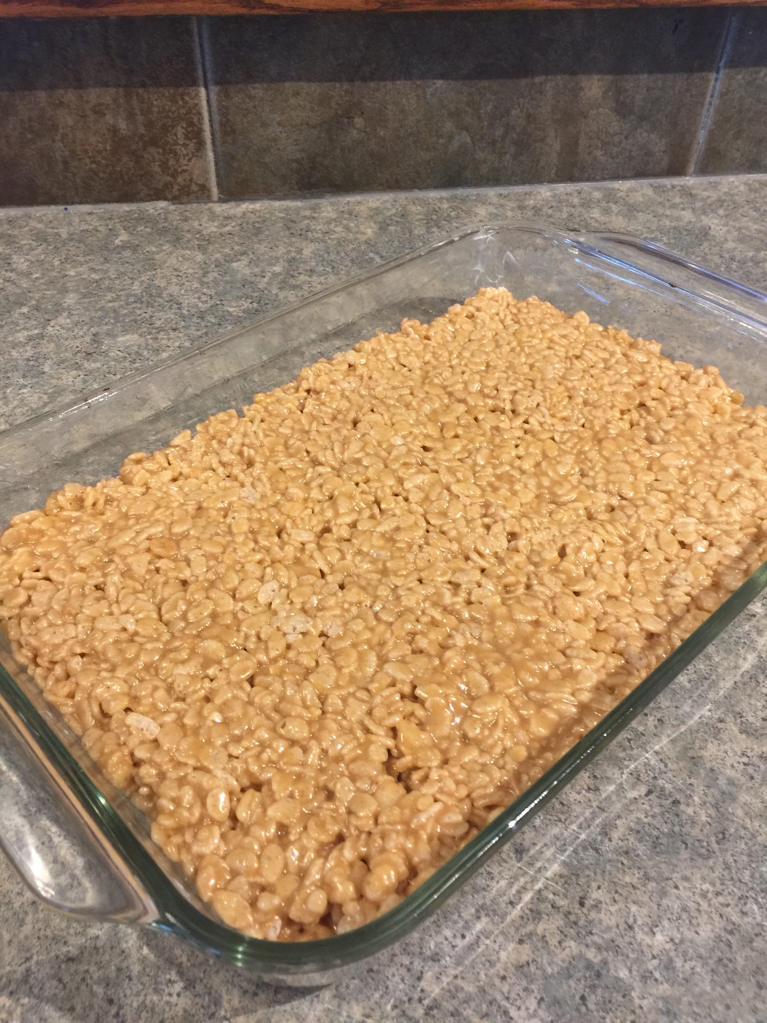 Grease a 13″ x 9″ x 2″ pan with cooking spray, or margarine, or butter. Set it aside and get out a big pot, I use my Dutch oven (6 quart) because it is easier to mix in all the cereal. Turn on your stove burner to medium and add the corn syrup and sugar. Keep your eye on it and stir the mixture until it starts to bubble and boil. Then take it off the heat and add the peanut butter. Stir, stir, stir until the consistency is super smooth and add the crispy rice cereal. I add the first 5 cups and then add the last cup. Why you say? Because sometimes I over fill one of those first 5 cups and then don’t need the all the 6th. It should be real gooey and the cereal completely covered with the peanut butter mixture. Once you are happy that ample gooeyness has been reached, dump that mixture into the greased pan and press it evenly into all the corners.