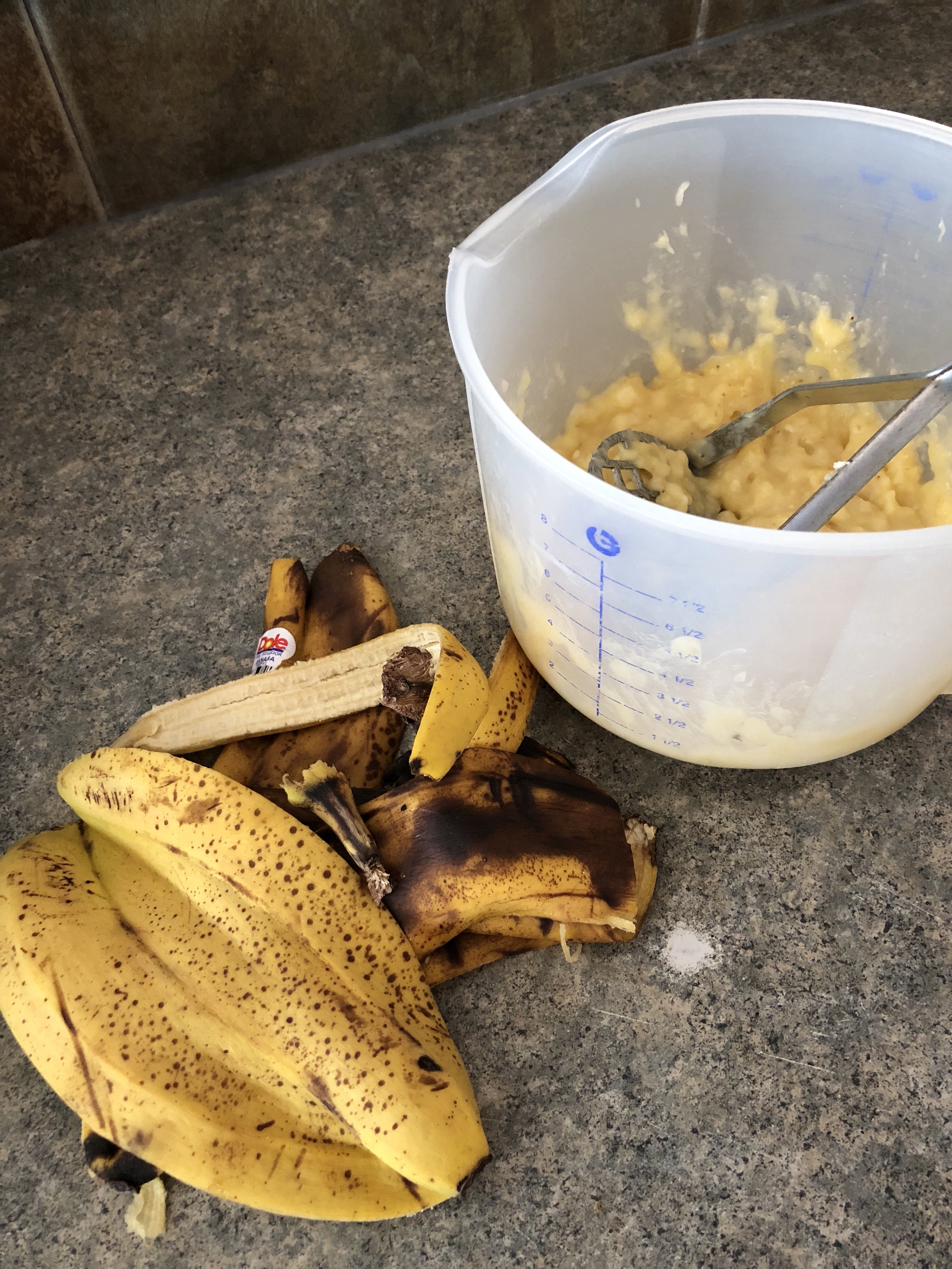 Peel the bananas and drop them into a larger sized mixing bowl. Using a potato masher or a fork, mash the bananas and then add the maple syrup, coconut sugar, peanut butter, vanilla, almond milk and egg. Depending on how much mixing power you have, either grab a wire whisk and use your raw strength, or take the high road and grab your mixette or mixmaster and let it do the work. I mixed for about 2 minutes in total.