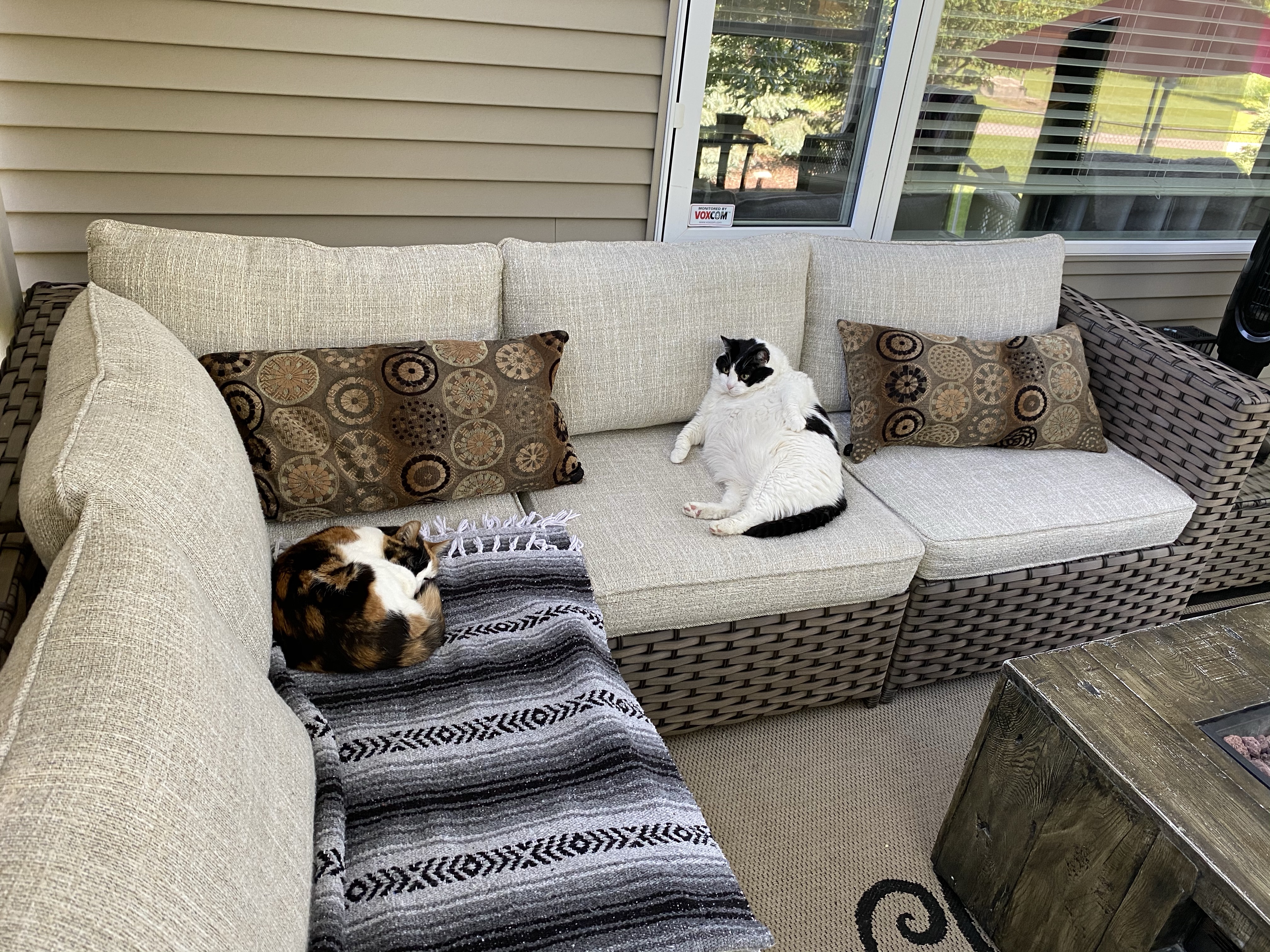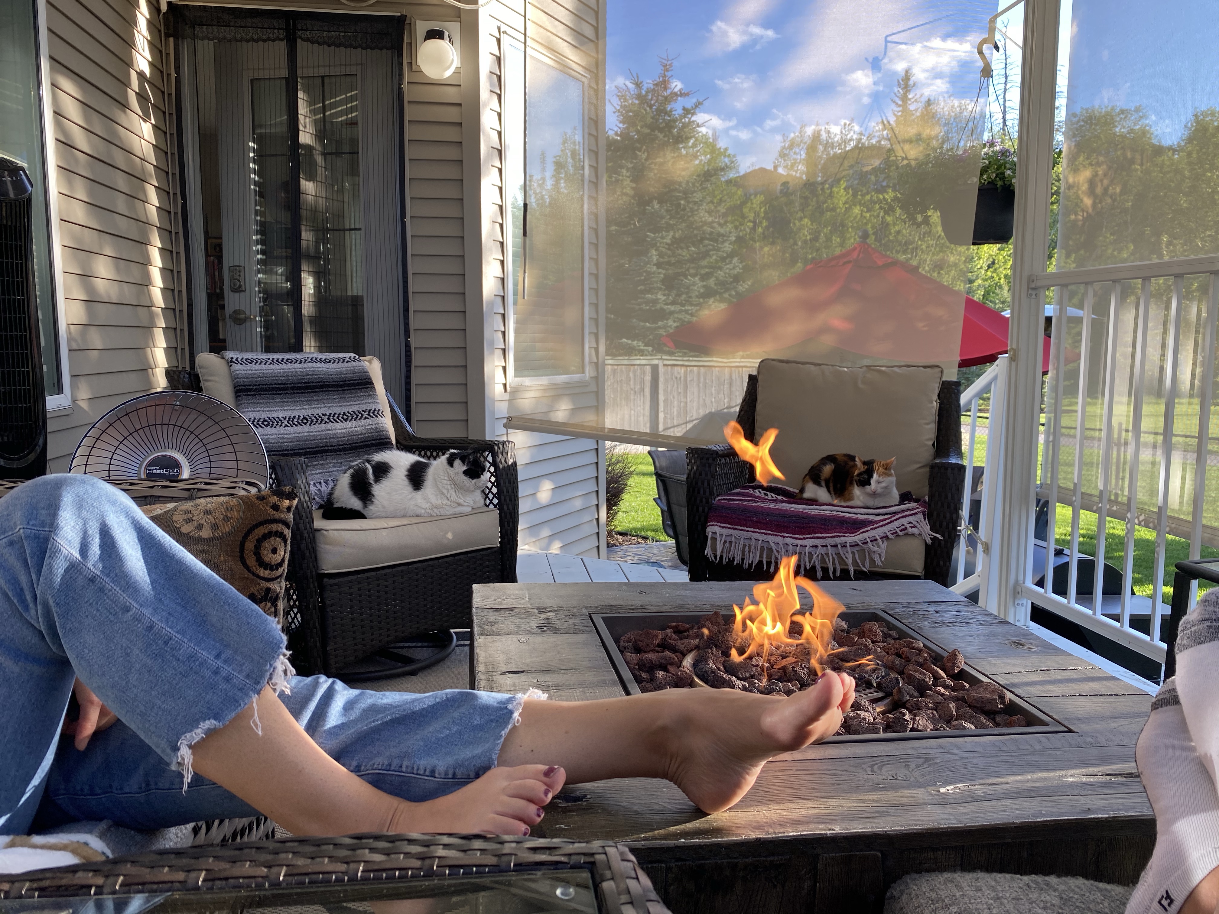I’m hoping to expand more on the Reno on another post. The choices we made and why. It’s a big leap and we tried to made big statements with a lower budget. But as everyone knows with renovations, more ideas are swirling in my head so stay tuned. ☺️ We then decided to insulate and drywall, paint the garage. And moved in an extra fridge to save having to walk downstairs. It holds the extra beverages ie wine, beer and the stuff get from Costco in multiples. We then moved onto our partially enclosed back deck and added glass railings to combat the elements. Now we have a fantastic extra room that we (and the cats 😺😺)have spent the summer enjoying. And will continue to enjoy into the fall.