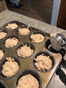 Spray 18 muffin cups with oil, or use paper cups. I use a 12 and a 6. Spoon, or cheat like I do, and use an ice cream scoop with a clicker to fill each cup 3/4 full.